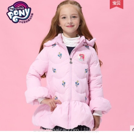 小马宝莉 女童加厚羽绒服 ,含绒量: 90%,荷叶边连帽设计,甜美可爱,防风保暖,可拆洗;简约泡泡袖,更显小女孩活泼气质;下摆裙摆式设计,时尚舒适,不挑身材,潮流萌酷。