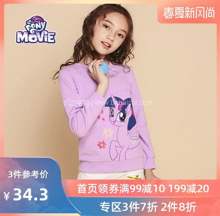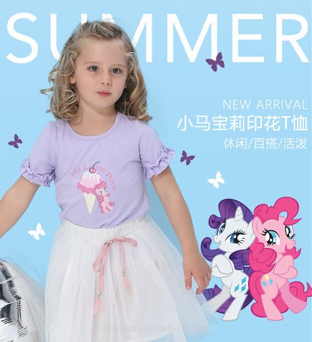 天猫商城售价¥89,可使用店铺¥40优惠券(移动端复制淘口令€r4Pm0zDbHl7€,打开手淘即可领券),实付¥49包邮,多色可选,90~140码全,小马宝莉印花T恤,孩之宝官方授权,休闲百搭,活泼可爱。天猫商城购买地址>>