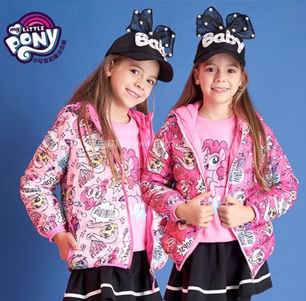 小马宝莉 2019新款90%鹅绒连帽轻薄羽绒服,90%白鹅绒,高蓬松度,保暖性更好;一衣两面,炫彩小马+纯色两面穿设计,可正反两穿;连帽设计,防风保暖;下摆收紧包边,保暖效果更佳。