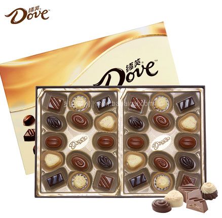 这款 Dove 德芙 精心之选巧克力礼盒装 280g,精选全球采购原料制作,精细研磨,精美切割,优良配比,口感丝滑,7种不同造型,打破常规,金色礼盒,送礼佳品。