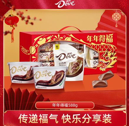 礼盒内含德芙牛奶巧克力252g*2碗+小巧粒丝滑牛奶巧克力84g*1袋,共计588g,大红色礼包装送人也非常喜庆。