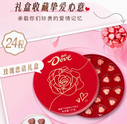 玫瑰恋语礼盒+礼袋,牛奶夹心口味,满满都是爱的味道。目前天猫商城德芙官方旗舰店售价¥28.9,APP下单可享百亿补贴优惠,实付¥19.9包邮。 天猫商城购买地址>>