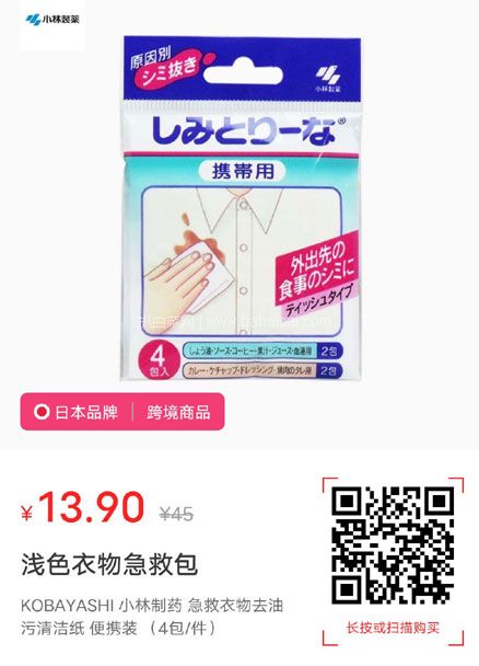 考拉海购内购折扣店:小林制药 急救衣物去油污清洁纸4包装 含税到手¥15.2