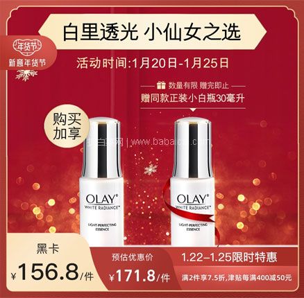库存浅,有需要的赶紧下单。美白好搭配,完美CP组合。目前天猫商城olay官方旗舰店售价¥319,参加跨店每满¥200-30活动,到手实付¥289包邮,买50ml送56ml,淡班、提亮一步完成。天猫商城购买地址>>