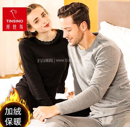 纤丝鸟 情侣款圆领含羊毛竹炭加绒内衣套装 ,面料成份:66.1%聚酯纤维+炭改性聚酯纤维29%,羊毛4.9%;升级加厚绒毛里层,长久聚热,柔软顺滑,亲肤舒适;时尚圆领,撞色条纹肩条,牢固包边耐洗,不易变形,保暖打底。