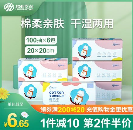 之前3包就要19.9元了!药企生产,干湿两用棉柔巾,200*200mm加大加厚 。目前天猫商城超亚医疗器械旗舰店 6包售价59.9元,下单立减¥5,领取¥20元优惠券,实付新低34.9元包邮,另外拍2件实付64.85元更划算。天猫商城购买地址>>