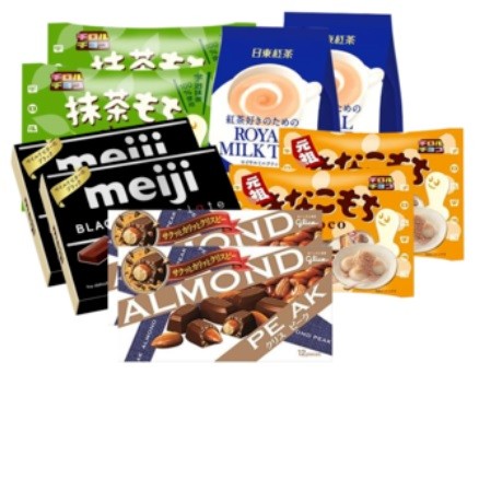 该款组合装包含:黑巧克力风味X2、格力高 糖烤杏仁夹心巧克力 12粒装X2、松尾 黄豆粉糯米糍夹心巧克力 7个X2、松尾 抹茶糯米糍夹心巧克力 7个X2,日东红茶 皇家奶茶 原味 10条装X2。