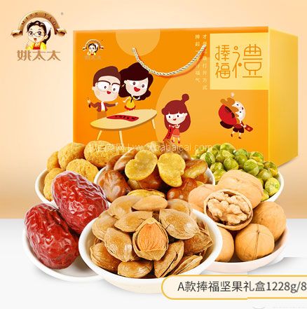姚太太 捧福坚果零食大礼包1692g,内含:小银杏188g、大核桃100g、新疆大枣1080g、多味花生108g、蒜香豌豆108g、牛肉味兰花豆108g。