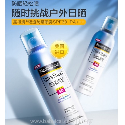 Neutrogena 露得清 轻透防晒喷雾141g,美国进口,防晒指数SPF30,同时含有防UVB和UVA成分,防水防汗配方,同时适用身体和脸部防晒。特含专利广谱防晒科技HelioplexTM,具备超强大的光稳定性,…… 阅读全文