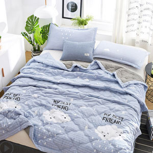 这款 馨丝蓝 水洗棉空调被,采用优质水洗棉面料,手感细腻亲肤,新一代活性印染技术,色牢度高,整张填充,可机洗水洗,不易板结、不易结团,超声波无线衍缝,做工细腻,INS风格,适宜各种家居搭配。