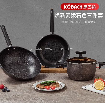 降¥60新低!百元出头的康巴赫锅具三件套,此价不抢再等一年!食品级麦饭石色不粘涂层,少油烟不粘,通用锅底,不挑炉灶。目前这款3件套天猫商城康巴赫聚客专卖店售价¥600,下单立减叠加¥341优惠券,叠加APP端价格下方¥600-60家装家居购物券,双重优惠实付新低¥109包邮,含30cm炒锅、26cm平底煎锅、20cm双耳汤锅,一套搞定。 天猫商城购买地址>>