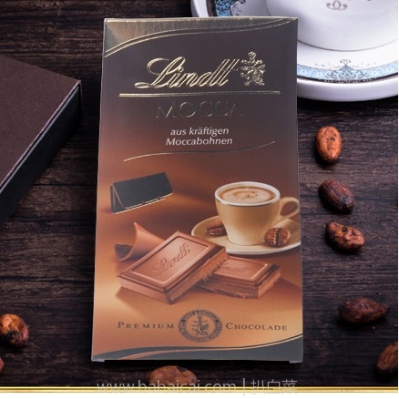 Lindt 瑞士莲特醇摩卡味黑巧克力,每块重100g,选用从非洲及南美各地甄选出最上乘的可可豆为原料,带有浓郁的摩卡香气,搭配美味的坚果,丝滑香醇。