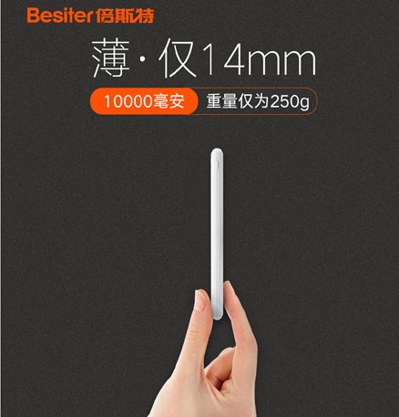 Besiter 倍斯特 超薄迷你移动电源,型号: BST-50000M,容量10000mAh,采用聚合物电芯,容量比普通的高出30%以上,大容量,持久续航,2.1A快充,厚度14mm,重量250g,双USB输出,兼容广泛。
