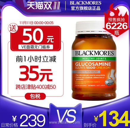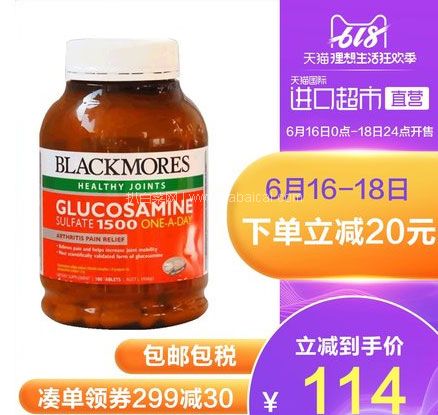 天猫Blackmores海外旗舰店这款澳佳宝氨糖软骨素胶囊180片双十一售价¥169,下单立减¥35,还可领取店铺¥35优惠券,下单实付新低¥99包邮包税,送老爸老妈尽孝心,一天一片,单瓶可服用180天。官方旗舰店出品,品质有保障,缓解疼痛,增强骨质。天猫商城购买地址>> | 双11预售主场及每天3次超级现金红包地址>>| 天猫更多特价推荐看这里>>
