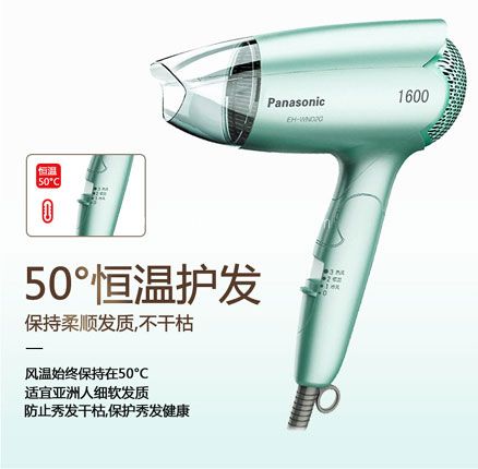 Panasonic松下EH-WND2G可折叠恒温吹风机,功率为1600W,快速吹干头发,3挡可选,热风/冷风/50℃恒温模式,能够适应不同的使用需求。采用可折叠手柄设计,方便携带,进口塑料材质,坚固耐用,并且拥有过热断电保护,保护使用者的安全。