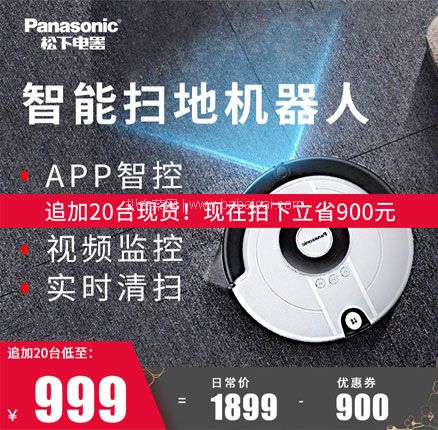 Panasonic 松下 新品MC-RS855 家用全自动智能扫地机器人,天猫商城 松下美祺三宝专卖店售价¥1899,叠加¥1000优惠券,券后实付¥899包邮到手,历史低价。 大扫除必备,吸扫拖一体,家用清洁好帮手。天猫商城购买地址>>