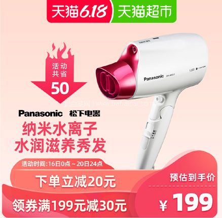 天猫超市售价¥249元,下单立减25元,领取¥20优惠券,app端价格免费领取¥199-30优惠券,88会员还可95折,到手实付¥170.05包邮。松下专利nanoe™纳米科技,水离子护发不伤发,天猫超市购买地址>>