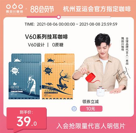 天猫商城隅田川旗舰店2盒10杯售价¥49,可使用¥25优惠券,实付新低¥24包邮,3款可选。V60系列挂耳咖啡,氮气保鲜,无添加,0蔗糖,便携易带,只需热水冲泡60秒就可随时随地享受媲美现磨口味咖啡。天猫商城购买地址>>